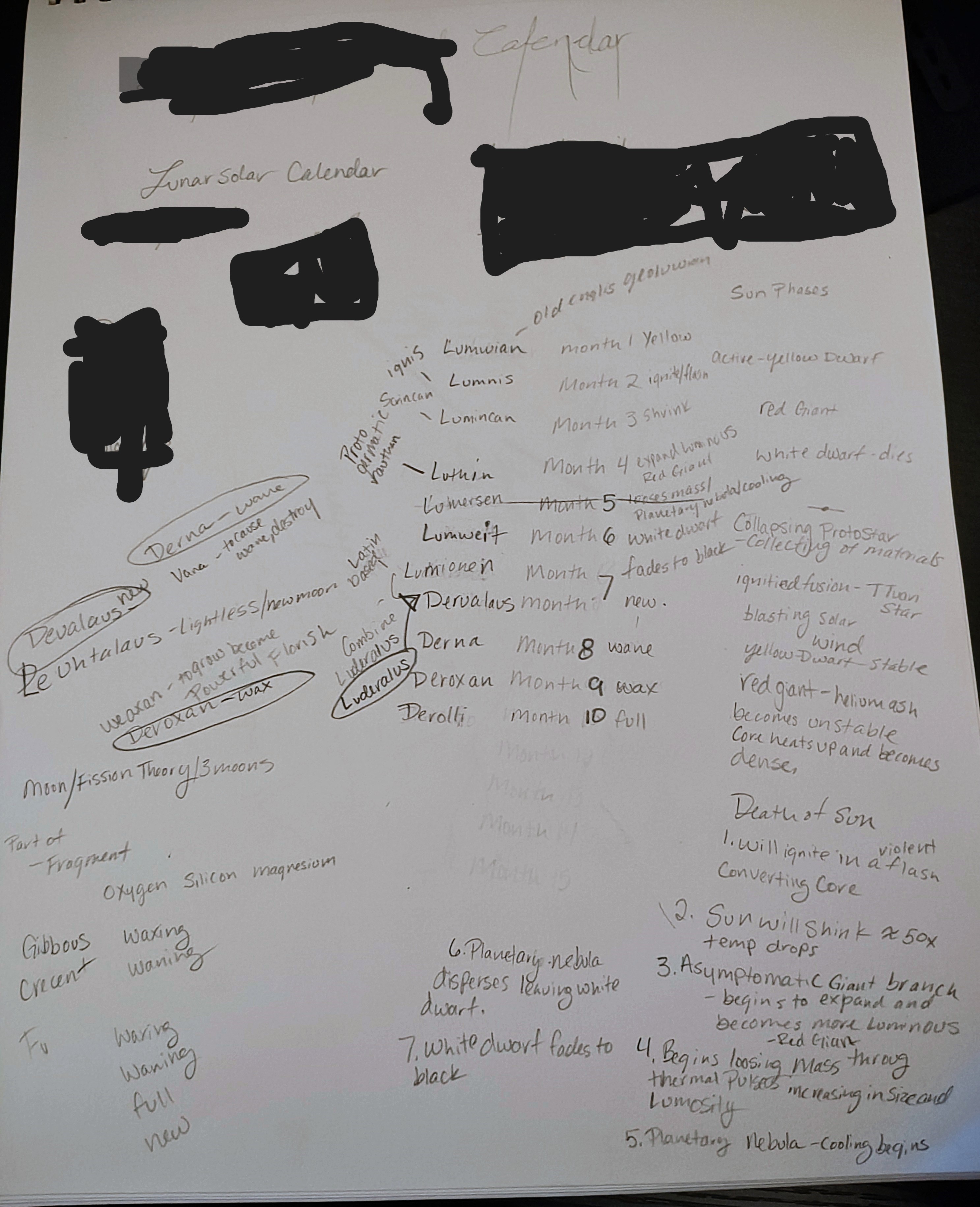 I had a fun time learning about etymology with this creation. Taking some of the key words from the stages of a suns death, I looked at the etymology of those words, then added them to some pre-existing world concepts to create new calendar names.