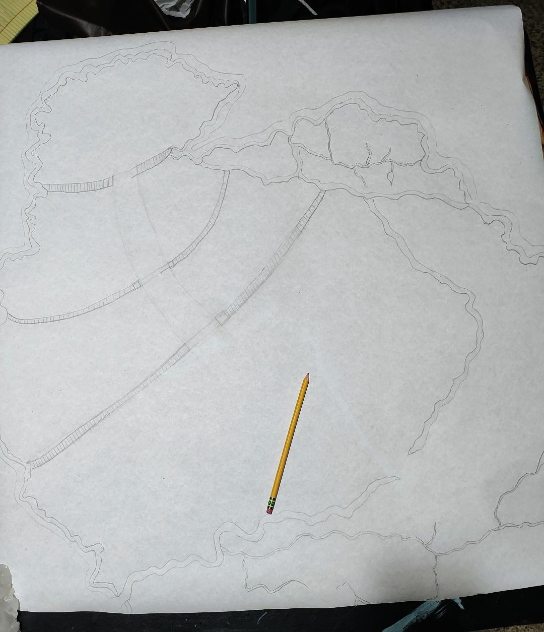 So, I got an idea. I created a general concept digitally and got the baseline down. Some of this map still wasn’t want I needed. But with a nearly burnt out projector on standby, I plugged my laptop in, taped some paper to the wall and created a giant outline.